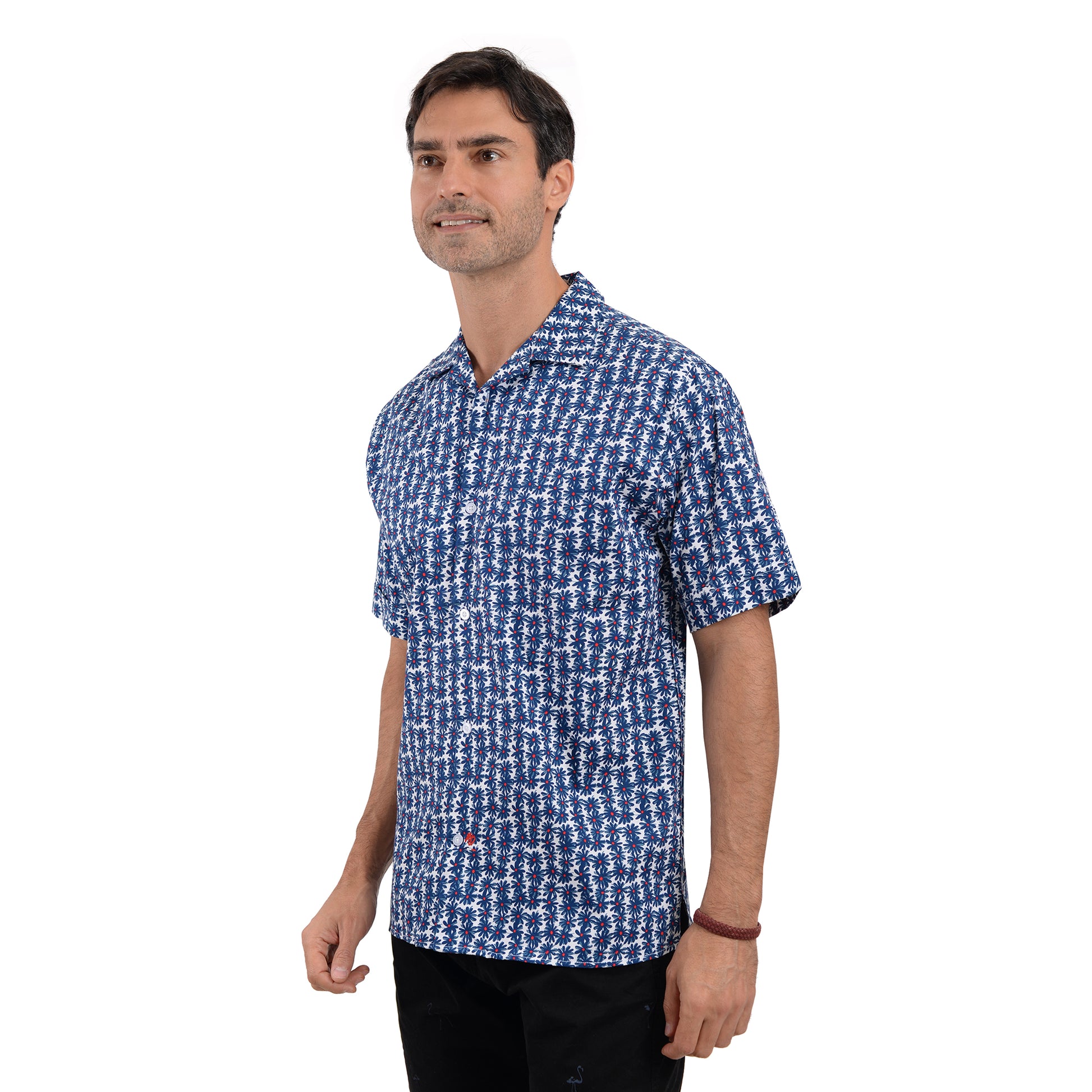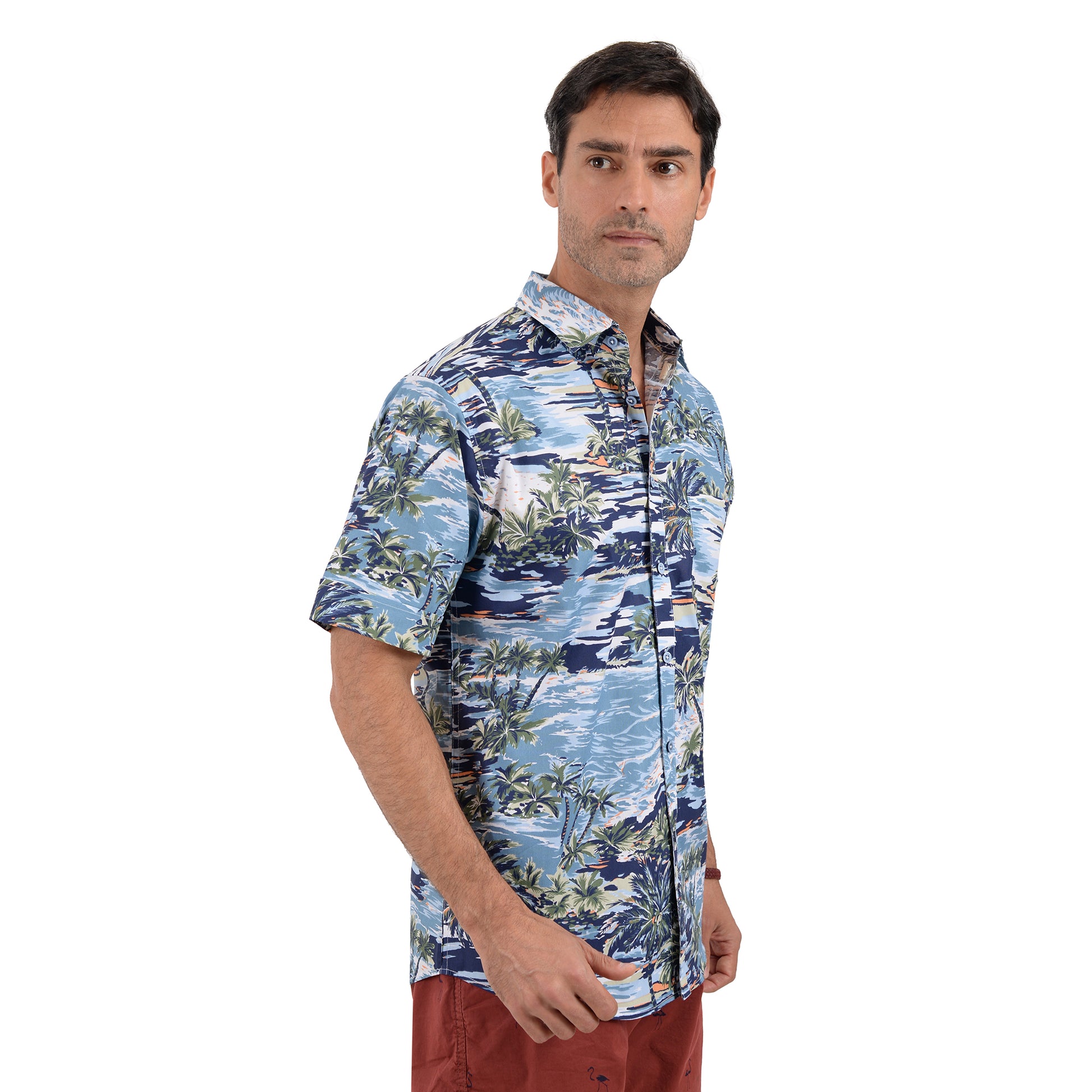 Características: Azul tranquilo con estampados de palmeras, 100% algodón, corte regular, perfecto para salidas informales o escapadas a la playa.